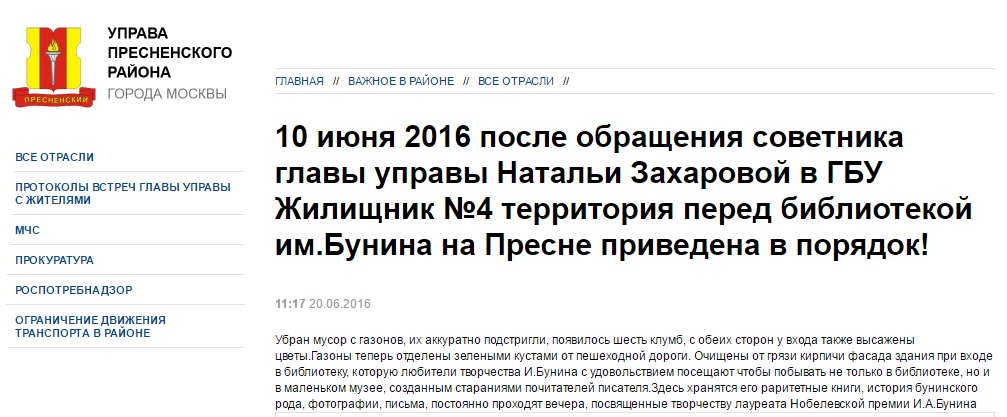 10 июня 2016 г. - территория перед библиотекой им.Бунина на Пресне приведена в порядок!
