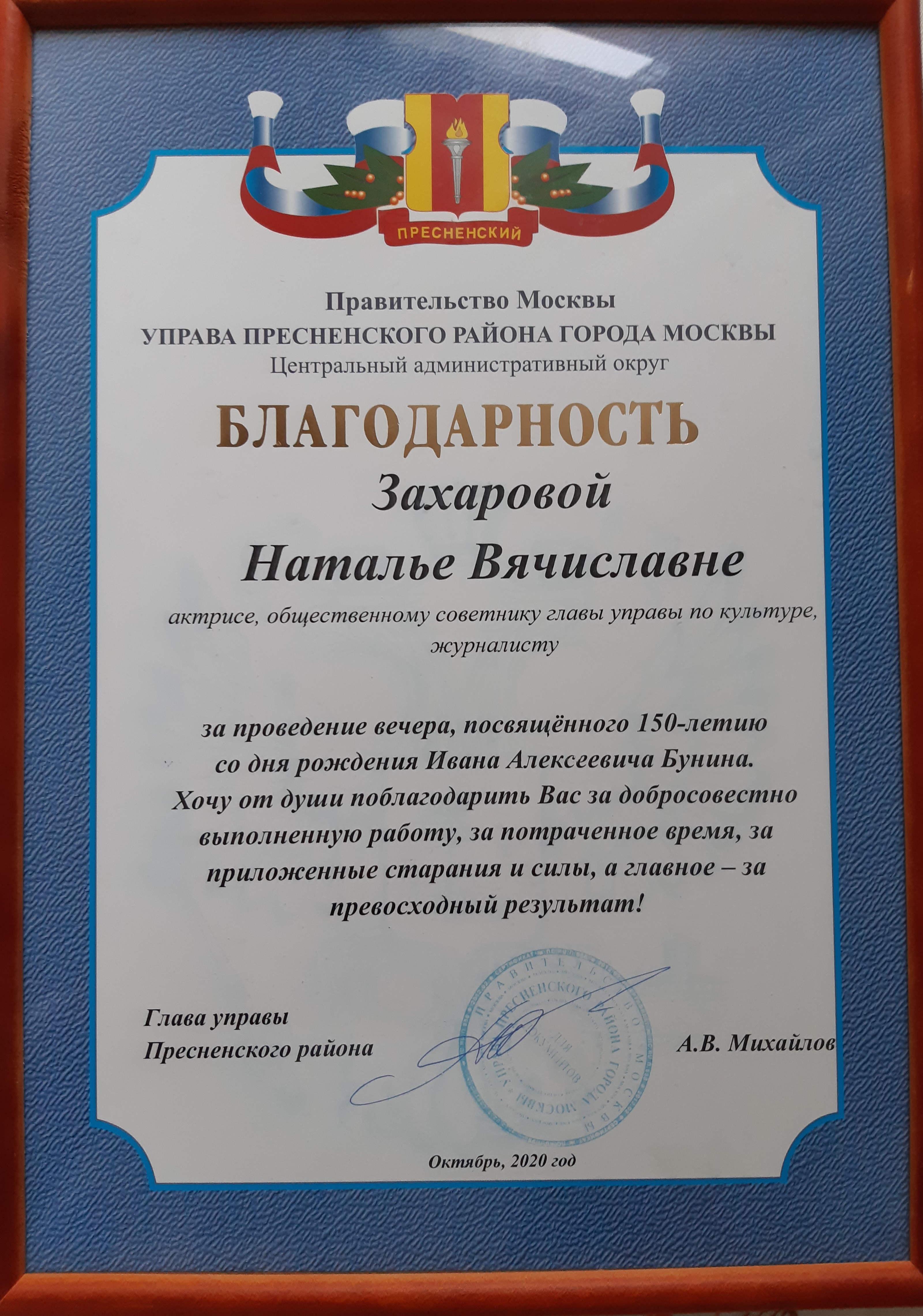 Глава наградил благодарственной грамотой актрису Наталью Захарову за активную деятельность и проведение вечера, посвящённого 150-летнему юбилею И.А.Бунина для жителей Пресни, дополнительно транслировавшийся в формате онлайн-концерта и который посмотрело более 500 человек, как в России, так и за рубежом.