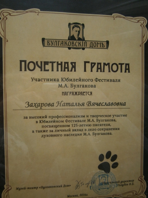 "15 мая на Пресне в доме-музее Михаила Булгакова открылся фестиваль, посвящённый 125-летнему юбилею со дня рождения писателя. Советник по культуре главы управы Пресненского района Наталья Захарова поздравила гостей и участников с открытием фестиваля. Актриса прочла отрывок из романа "Мастер и Маргарита". Директор дома-музея М.Булгакова, Николай Голубев наградил её памятной медалью и почётной грамотой фестиваля. Наталья Захарова поделилась своими впечатлениями о юбилее писателя с телеканалом Россия-1."