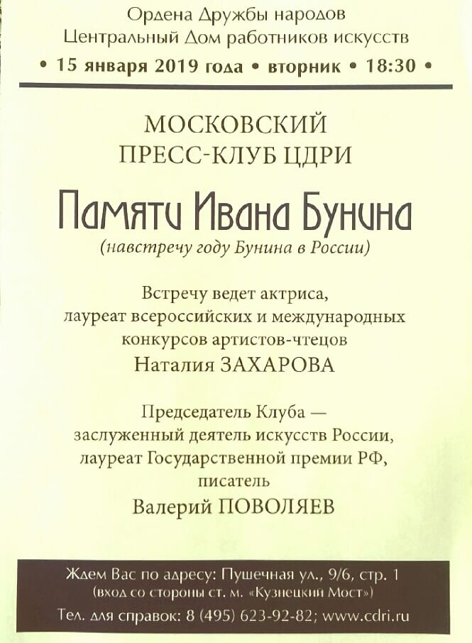 На вечере также было зачитано обращение к Президенту РФ о создании музея Бунина в Москве и были собраны подписи почитателей творчества писателя.