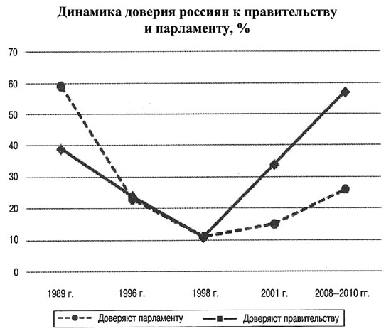 Примечательно в этой связи, что некоторый рост оптимизма сопровождался и ростом доверия к власти именно в те последние годы, когда критический уровень недоверия, характерный для 90-х - начала нынешнего десятилетия годов, был пусть не намного, но оказался преодолен[17]. Подобное совпадение не может быть случайным: общий процент оптимистов и тех, кто доверяет власти, и темпы роста этой доли граждан совпадают. Что, в общем-то, не удивительно. У В. Путина был огромный ресурс доверия общества, когда он мог предложить свою идеологию и свою стратегию. Он этого не сделал. Не сделал позже и Д. Медведев.