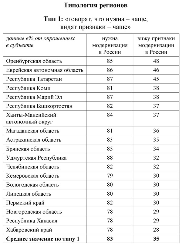 Тип 1 "говорят, что нужна - чаще, видят признаки - чаще": субъекты, в которых респонденты чаще, чем по РФ в целом, говорят, что модернизация в России нужна, и чаще видят ее признаки.