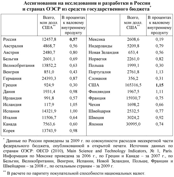 Рост расходов предусмотрен только на проведение прикладных научных исследований. При сокращении расходов в реальном выражении по разделу в целом в 2008 и 2009 году, к 2010 году они несколько превышают уровень 2007 года. Но их доля совершенно не соизмерима с долей расходов в бюджетах стран, претендующих на лидерство в науке и технологиях[11].