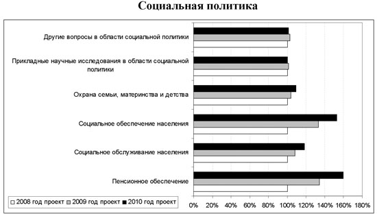 При этом учет инфляционных процессов показывает, что при росте расходов на охрану семьи, материнства и детства, пенсионное и социальное обеспечение, расходы на социальное обслуживание населения прогнозируются на уровне, незначительно превышающем уровень 2010 года, при снижении расходов на прикладные научные исследования и другие вопросы в области социальной политики.