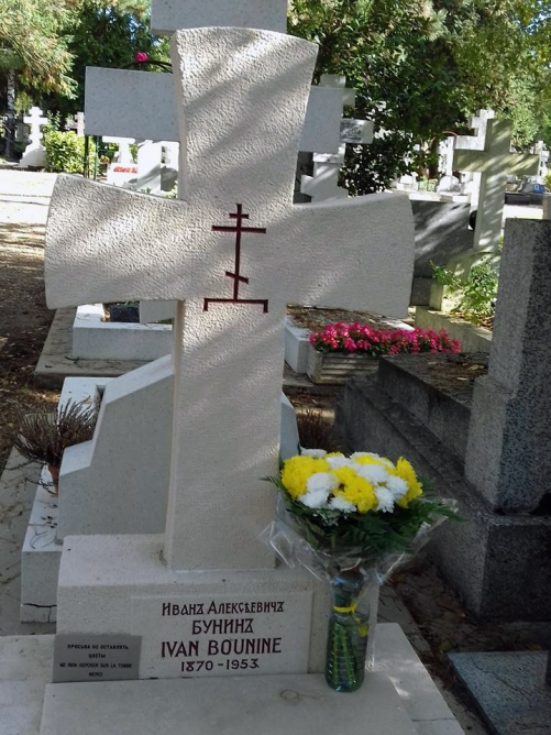 Напротив могилы Бунина растёт сосна. Она сбрасывает на могилу свои иголки и шишки. Иван Алексеевич, так любивший природу, думаю доволен. Но я все-таки помыла плиту.