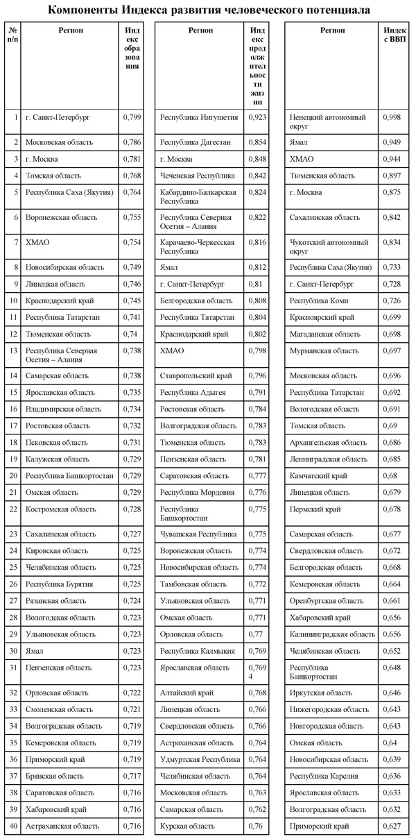 Это в основном республики Северного Кавказа, регионы Поволжья, Урала, Дальнего Востока и Сибири. Если сравнивать эту группу регионов с глобальным индексом, то они бы вошли в группировку стран и территорий со средним уровнем развития человеческого потенциала и разместились между такими государствами, как Китай, Туркменистан, Таиланд, Парагвай, Молдавия, Монголия, Египет, Узбекистан, Намибия и Гондурас. Доклад еще раз доказывает, что уровень дохода и экономический рост не всегда положительно коррелирует с улучшением качества жизни и человеческого потенциала, а также показывает значительные диспропорции в региональном развитии Российской Федерации.