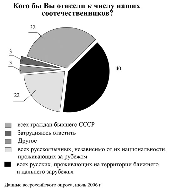 "Зрелость" России - это понимание специфики нынешнего периода интеграции бывших регионов российской и советской империй. При этом, несмотря на фактическое бездействие, в России пока сохраняется идентификация по культурному и политическому признаку. Как свидетельствует опрос ВЦИОМ, к числу соотечественников граждане относят (33% опрошенных) - всех граждан СССР, (40%) - всех русских; (22%) - всех русскоязычных. Другими словами, абсолютное большинство граждан России (94%) полагает, что к числу соотечественников относятся граждане ближнего зарубежья, культурно-политически и исторически связанные с СССР[10].