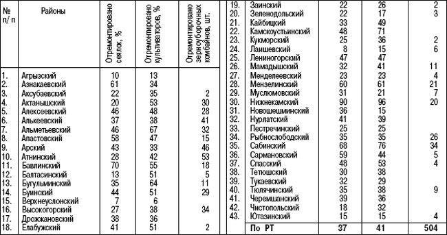 В условиях сокращения машинного парка и высокого процента износа техники из-за длительной эксплуатации без организации зимнего ремонта невозможно обеспечить нормальный ход уборочных работ, без поломок и потерь зерна. Пример тому - прошедшая уборочная кампания. Так, если в среднем по республике уборку урожая зерновых завершили за 49 дней, то в отдельных хозяйствах ее затянули до двух месяцев. Несвоевременно проведенный и некачественный ремонт комбайнов дал знать о себе уже с первых дней жатвы. Из-за выхода в поле неподготовленных комбайнов технический потенциал в первые дни страды в Мензелинском, Тетюшском, Чистопольском, Азнакаевском районах использовался лишь на 30-40 процентов, что стало одной из главных причин затягивания жатвы.