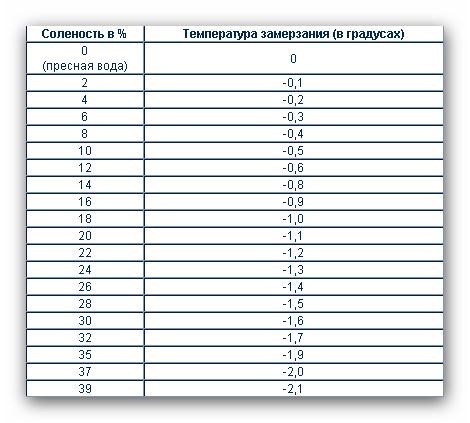 У соленой воды температура замерзания понижается по мере увеличения солености. В диапазоне солености от 30 до 35 промилле точка замерзания меняется от -1.6 до -1.9 град.