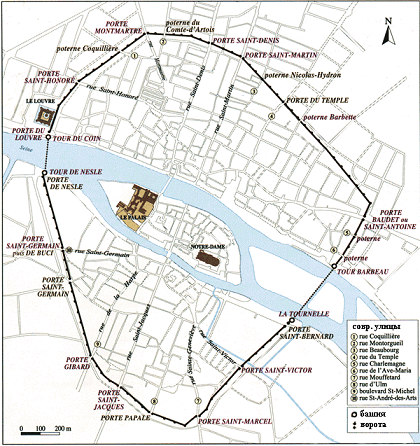 Обнесённый первой стеной, построенной по приказу короля Филиппа-Августа, город насчитывал уже 310 улиц, 36 из них были на острове Ситэ, 80 на Университетском берегу и 194 «за мостами», т. е. на правом берегу.