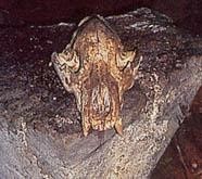 Череп пещерного медведя, найденный в той же пещере «Chauvet» во Франции. Он был заботливо установлен на куске скалы, а внизу, на полу пещеры, валялось множество фрагментов черепов.