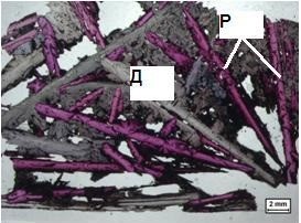 Микрофотография шлака, прозрачный шлиф. (Р – рубин, Д – дяоюдаоит). Ширина кристаллов рубина около 2 – 3 мм, длина до 15 мм