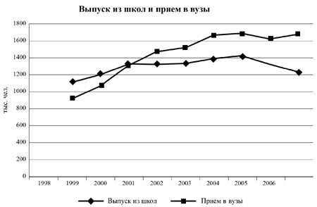 Из приведенных В. Мау данных видно, что если количество выпускников устойчиво снижалось, то количество поступающих в вузы - устойчиво увеличивалось[22]. На этом основании некоторые чиновники и эксперты делают вывод о необходимости сокращения приема в институты. Чаще всего - под благовидными предлогами "повышения качества образования" и "сокращения бюджетного финансирования".