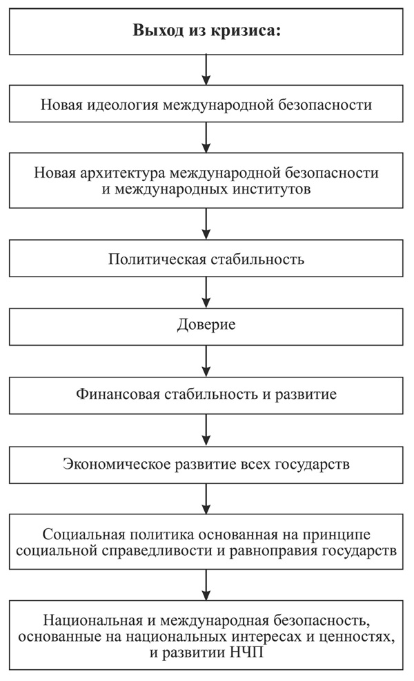 Аналогична должны быть последовательность и выхода из кризиса Представляется, что неизбежен поиск новых мировоззренческих и идеологических решений, предполагающий отказ от старой системы международных отношений, моделей межгосударственных и блоковых связей.