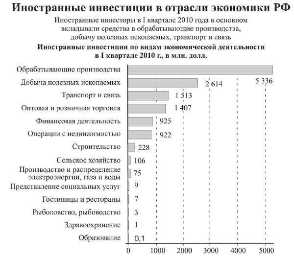 Необходимость этого подкрепляется дополнительно еще двумя важными обстоятельствами. Во-первых, тем, что широко рекламируемое условие развития - иностранные инвестиции - не идут в области, связанные непосредственно с развитием НЧП, что видно, например, из структуры иностранных инвестиций в 1 квартале 2010 года, отражающей общую тенденцию[19].
