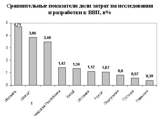 Во-вторых, по относительным величинам расходов на науку (доля в ВВП) Россия уступает практически всем государствам. Если же вычесть из этих расходов средства на военную науку, то эта величина будет одной из самых низких.