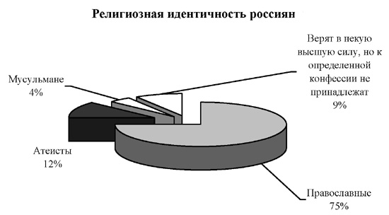 Таким образом, 88% россиян имеют сегодня те или иные религиозные верования. На первый взгляд, это очень много, причем если говорить об изменениях в этой области за последние 15 лет, то доля неверующих сократилась в разы - в 1995 году, когда первый ренессанс религиозности уже прошел, как православных себя идентифицировала лишь треть россиян, доля неверующих достигала 28%, а верящих в сверхъестественные силы, хотя и не верящих в Бога, было около 10%. Однако уже тогда религиозная, и прежде всего православная, идентичность носила у россиян достаточно условный характер - из числа респондентов, идентифицировавших себя как принадлежащих к различным конфессиям, довольно значительная часть говорила, что в Бога как такового они не верят или же колеблются между верой и неверием в него. Минимальной эта часть была у последователей ислама (17%), а максимальной - у сторонников православия (45%)[19].