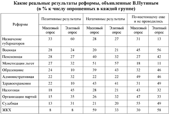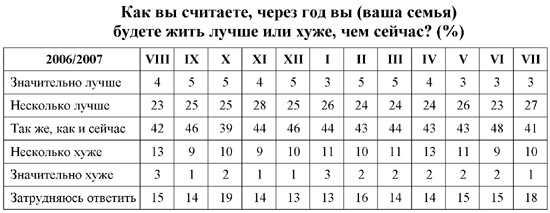 Социальный разлом между отдельными группами граждан хорошо виден из соцопросов, где группы "пессимистов" и "оптимистов", сформировавшиеся за последние годы, сохраняли относительную устойчивость в период возможного перехода от стабилизации к развитию в 2006-2007 годы