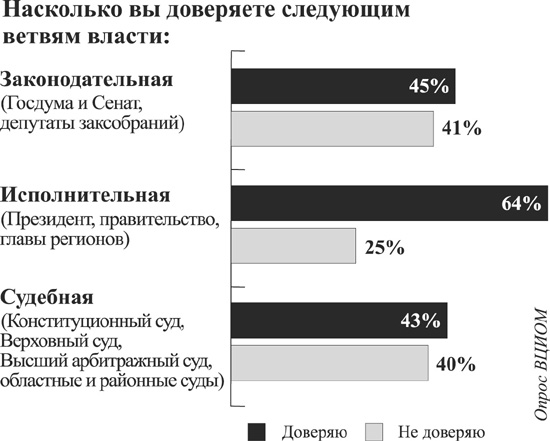 Примечательно в этой связи, что некоторый рост оптимизма сопровождался и ростом доверия к власти именно в те последние годы, когда критический уровень недоверия, характерный для 90-х-начала нынешнего десятилетия годов, был пусть не намного, но оказался преодолен[17]. Подобное совпадение не может быть случайным: общий процент оптимистов и тех, кто доверяет власти и темпы роста этой доли граждан совпадают. Что, в общем-то, не удивительно. У В.Путина был огромный ресурс доверия общества, когда он мог предложить свою идеологию и свою стратегию. Он этого не сделал. Не сделал позже и Д.Медведев.