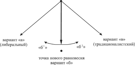 В целом можно констатировать, что в 2007-2010 годы "колебания маятника" шли по затухающей, ограничивая возможный вектор идеологического выбора правящей элиты. Хотя возникали и различные "толчки" как в направлении вектора "а" (либерального), так и "в" (консервативно-традиционалистского) На рисунке это можно было бы изобразить следующим образом. К 2010 году стало окончательно ясно, что никакого возврата уже не будет. Но не стало ясно, однако, какой из социально-консервативных вариантов будет доминировать: традиционалистский, националистический или русского социализма.