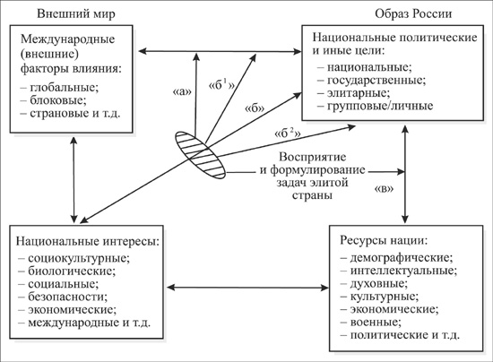 Любой из этих вариантов это прежде всего: осознание правящей элитой национальных интересов и ценностей (со всей своеобразностью подходов); формулирование целей и приоритетов; оценка международных реалий и распределение (перераспределение) ресурсов.
