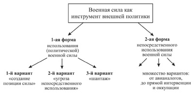 Для США всегда было принципиально важным сохранить военную силу в качестве инструмента своей внешней политики, который использовался всегда по-разному. Причем косвенное использование, как правило, было многократно эффективнее прямого. В стратегии США этому всегда уделялось много внимания, что можно изобразить на следующем простом рисунке.
