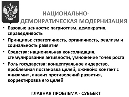 Трудно возразить И. Дискину, предлагающему свой вариант "национально-демократической модернизации", как и реальные ценности, особенно патриотизм и справедливость.