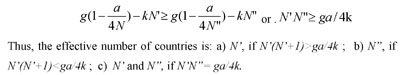 an integer in the interval (M,M+1). Then the effective number of countries will be N`, if and only if s`=1/N` gives average utility at least equal that is given with the size s=1/N", which is possible if an only if:
