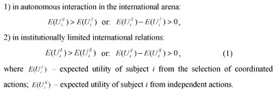 Thus, the overview of the existing theoretical approaches to economic modeling of international processes, given above, "depicts" the economy of international relations as a process of interaction the nature of which depends on the correlation of the benefits and costs of the alternative decisions that the participants in this process have. The necessary economic condition of the actions taken by subjects of international relations is the excess of expected utility of these actions over expected utility of decisions alternative to them. In view of the fact that the main (basic) alternatives in the process of international interaction (at the contemporary stage of their development) are the coordinated (with the interests or preferences of other subjects) actions and independent (from other subjects and interests) actions, this condition for decision making can be mathematically written as follows: