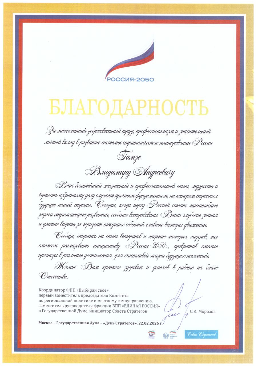 Благодарность от Государственной думы за многолетний добросовестный труд, профессионализм и значительный личный вклад в развитие системы стратегического планирования России