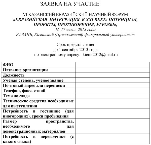 Заявку направлять по адресу: 420008, г. Казань, ул. Кремлёвская, 18, а/я 19, Казанский (Приволжский) федеральный университет.