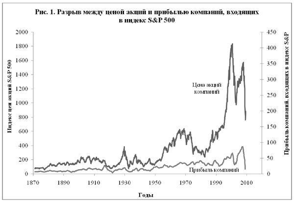 Представляется, что принимаемые меры, о которых было упомянуто выше, помимо обозначенных недостатков направлены, кроме того, на борьбу с последствиями кризиса, а не с его причинами. В качестве основных причин глобального финансово-экономического кризиса, по нашему мнению, можно назвать углубляющееся противоречие между размерами фиктивного и реального капитала. Все большие масштабы в мире приобретают сделки слияний и поглощений, спекулятивные операции с ценными бумагами, операции с производными финансовыми инструментами, в частности кредитными деривативами. Указанные процессы приводят к тому, что доходы будущих периодов истрачены уже сегодня, рост инвестиций в реальные активы, а также стоимость реальных активов и ее прирост – условия роста указанных будущих доходов – существенно отстают от роста стоимости компаний на финансовом рынке, то есть возникают `финансовые пузыри`. В качестве иллюстрации подобной ситуации можно привести данные о сравнении динамики капитализации и объемов прибыли компаний, входящих в индекс S&P 500 (рис. 1[3]).