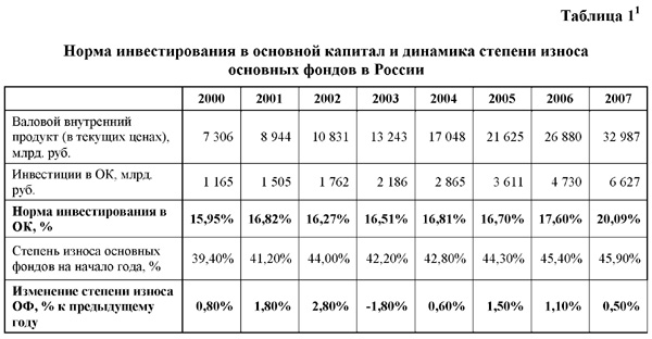 В табл. 3 представлены статистические данные о размере ВВП, объемах инвестиций в основной капитал и степени износа основных фондов в России. Норма инвестирования в основной капитал представляет собой отношение объема инвестиций в основной капитал к размеру ВВП за период. Таблица 3[8]