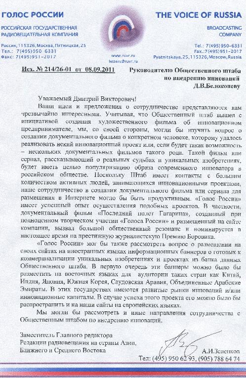 Исходя из таких задач и сложившейся объективной обстановки руководство Общественного штаба по внедрению инноваций провело комплексную работу совместно с рядом российских СМИ. Предметом взаимодействия стала выработка совместных решений по вопросу популяризации образа инновационного предпринимателя и создания устойчивого спроса на российские инновации на зарубежных рынках. Результатом взаимодействия стали предложения со стороны Российской Государственной Радиовещательной Компании "ГОЛОС РОССИИ" в адрес Общественного штаба.