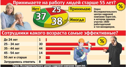 Правда, социологические опросы показывают, что люди пожилые и сегодня востребованы. Так, кадровая компания SuperJob изучила возрастные предпочтения бизнесменов при найме работников. Оказалось, что четверть предпринимателей охотно берут пенсионеров в штат. Еще больше - 37% топ-менеджеров - нанимают пенсионеров от случая к случаю. И лишь 38% работодателей категорически не берут пожилых людей ни при каких условиях.