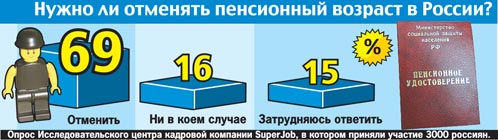 Так вот, 69% россиян, опрошенных компанией SuperJob, выступают за отмену пенсионного возраста. Единственное условие - сохранение пенсии с 55 лет для женщин и с 60 - для мужчин. Население хочет получить рычаг против работодателей, которые наступление пенсионного возраста используют в качестве повода, чтобы расстаться с человеком.