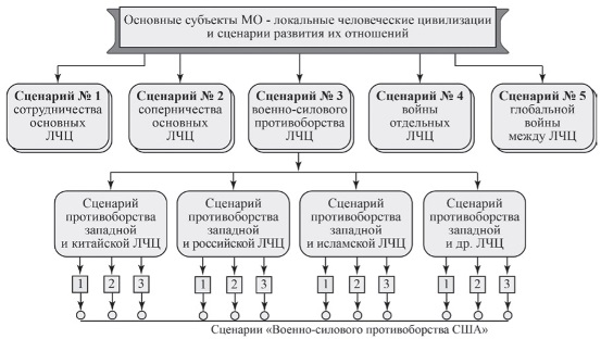 Можно допустить, что общий Сценарий отношений между ЛЧЦ (в нашем случае Сценарий № 3) не будет наиболее вероятным. Таковым, возможно, будет, например, Сценарий № 2 («Соперничества»), который «уже в чистом виде» не сохранился: отношения западной ЛЧЦ с часть исламской ЛЧЦ, уже перешли на уровень Сценария № 3, а отношения российской ЛЧЦ — фактически приблизились к этому уровню.