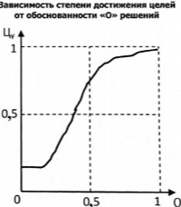График на рисунке 3 характеризует влияние длительности цикла — Т управления на степень достижения целей, а график на рисунке 4 отражает зависимость степени достижения целей от обоснованности управленческих решений. Здесь обоснованность характеризуется вероятностью принятия решения, оптимального для достижения цели обеспечения безопасности государства в конкретно сложившейся обстановке. Анализ этих зависимостей показывает, что уже сегодня управлять процессом обеспечения безопасности неоперативно или на основе недостаточно обоснованных решений — все равно, что не управлять вовсе[7].