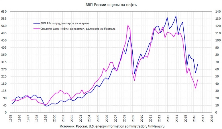 Розовая линия отображает среднюю цену за баррель нефти. Синяя линия — ВВП России, выраженный также для удобства в долларах. Примечательна на графике вторая половина 2012 года. Еще нет санкций, еще нефть котируется высоко, но ВВП России начал расти заметно быстрее, чем нефтяные цены. А это как раз и говорит о том, что уже с этого момента стали заметными результаты системной перестройки российской экономики. Именно результаты, так как сама эта работа проводилась много раньше.