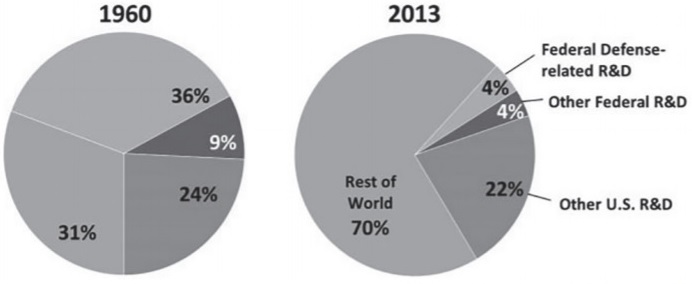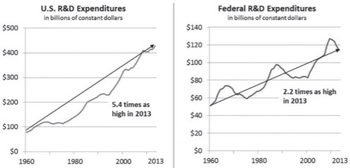 Однако подобное относительное падение американских расходов на НИОКР сопровождалось их абсолютным ростом (в постоянных целях), который составил за 1960–2013 годы 220%, а в целом 540%.