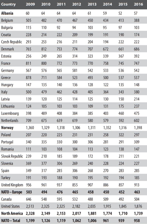«Теоретически расходы на оборону в НАТО могут быть не как в Албании (60 $ долл.), а как в Норвегии (1400,0 долл.) на человека.