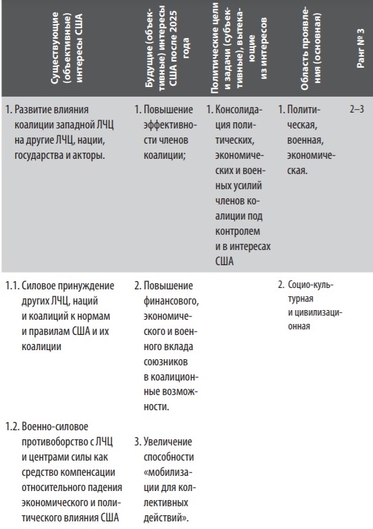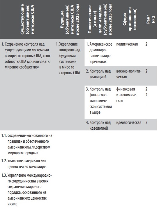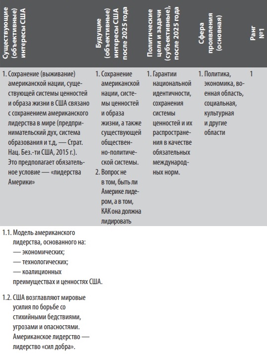 Таблица 1. Группа I. «Интересы национальной безопасности собственно США и их системы ценностей» (интересы 1-го ранга)