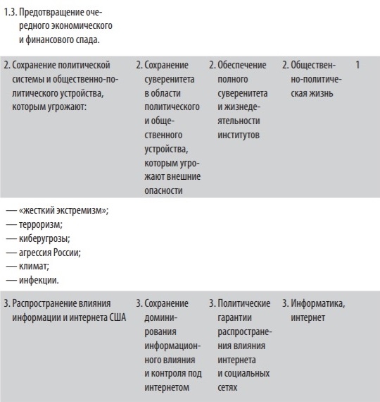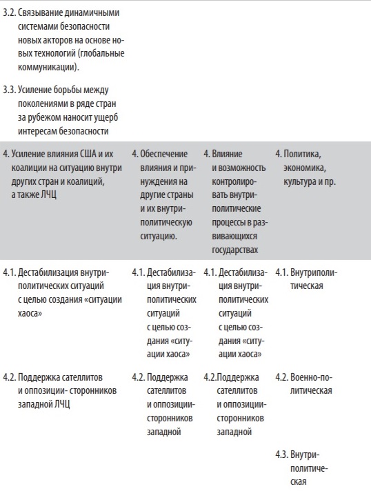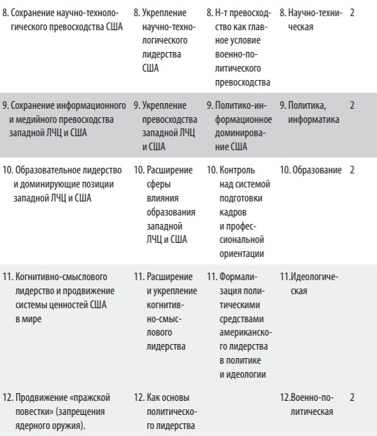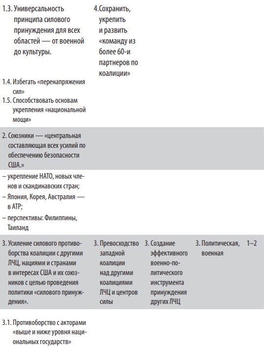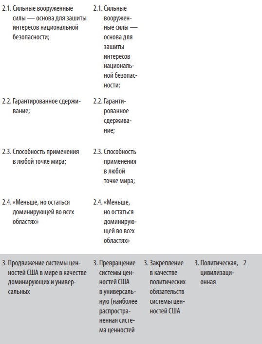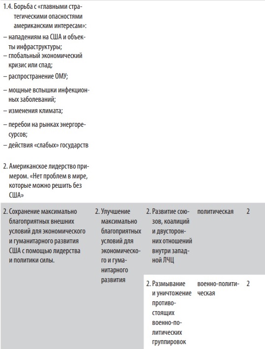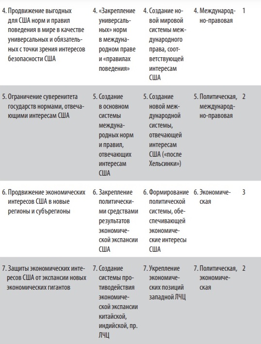 Таким образом, если составить матрицу основных интересов США, то они делятся на 16 основных групп интересов продолжительностью (длительностью) в три временных периода — краткосрочный, среднесрочный и долгосрочный — т.е. таких групп интересов может быть вычленено в три раза больше.
