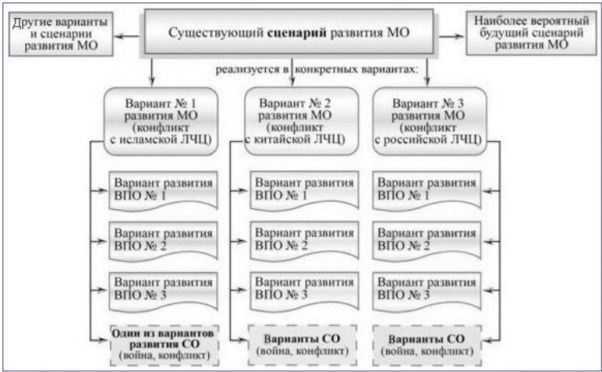 – каждый из этих вариантов делится в свою очередь на несколько сценариев (и их вариантов) развития ВПО, а те – на конкретные (как правило, уже существующие либо потенциальные) сценарии развития СО, войн и конфликтов.