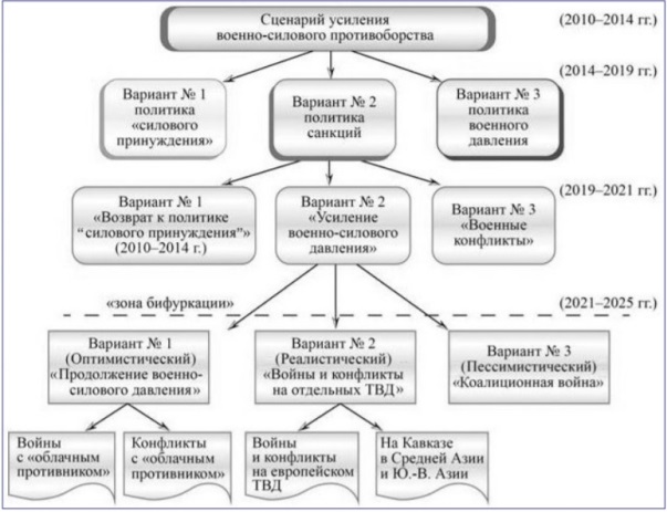 Дальнейший анализ и прогноз развития ВПО предполагает выделение одного из трёх вариантов развития ВПО, которые в предложенной схеме достаточно обще назывались Вариантами № 1–3 развития ВПО. Один из этих вариантов развития ВПО при дальнейшей конкретизации был обозначен в качестве сценария усиления военно-силового противоборства (рис. 2), который сформировался в 2010–2014 гг. при администрации Б. Обамы в Варианте № 2 («Политика санкций») (рис. 2), просуществовавшем до прихода к власти Д. Трампа.