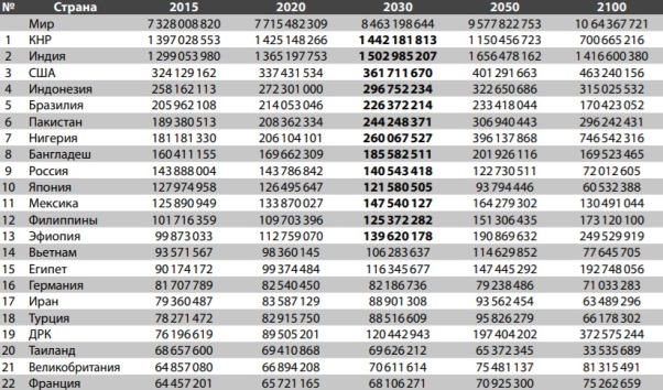 Для того чтобы полнее представить себе общую картину, ниже приведён список стран мира с прогнозируемой численностью их населения по оценке Департамента по экономическим и социальным вопросам ООН. Приведён средний вариант прогноза (по состоянию на 1 июля 2015, 2020, 2030, 2050 и 2100 годов)
