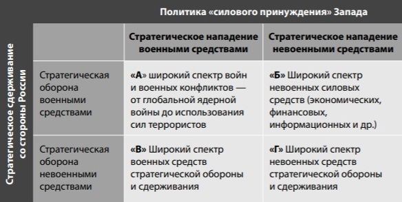 Подобная перспектива неизбежно ставит вопрос о возможности эффективного не только военного, но и не военного противодействия со стороны России, т.е. в конечном счете о сохранении суверенитета и национальной идентичности в будущем. Можно представить эту политику в качестве реакции на политику «силового принуждения» Запада в виде некой матрицы следующим образом (см. табл. 1), которая вполне подходит под определение политики «стратегического сдерживания», но вполне может представлять её самые разные формы[8].