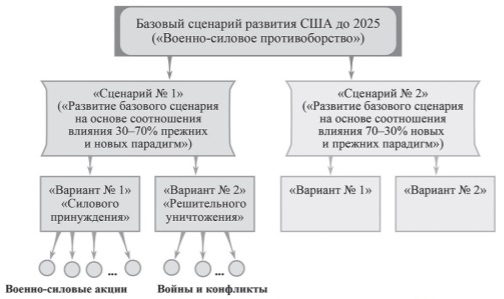 Таким образом, доминирующий Сценарий развития США до 2025 года — «Военно-силовое противоборство», — станет исходной базой для превращения в один из двух базовых сценариев развития США после 2025 года — «Сценария № 1» («Развитие на базе прежних парадигм») и «Сценария № 2» («Развитие на базе новых парадигм»), которые будут определяться, прежде всего, достигнутым соотношением между старыми и новыми парадигмами к 2025 году и теми вариантами развития до 2025 года, которые будут доминировать.