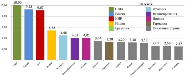 Рис. 1. Рейтинги стран в соответствии со значениями коэффициентов нормированного военного потенциала (Кнвп)[4]