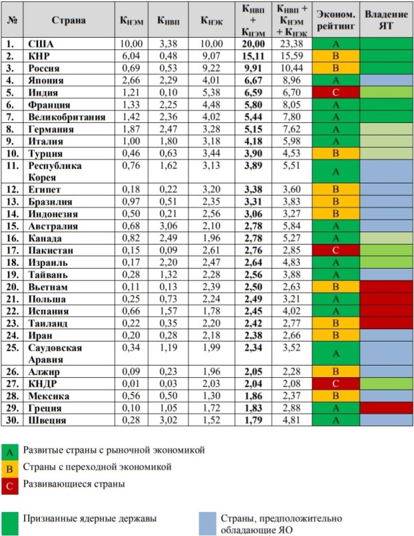 В таблице 1 представлен перечень стран, ранжированных по сумме коэффициентов (Кнвп + Кнэм), что в большей мере из всех рассмотренных вариантов соответствует усредненной экспертной оценке соотношения политических потенциалов рассматриваемых государств. Приведенный анализ подчеркивает значимость фактора обладания ЯО. Так при рассмотрении 10 лидирующих стран данного перечня, можно отметить, что не все из них обладают передовым уровнем развития экономики, однако каждая из них имеет возможность использовать в своей внешней политике инструменты ядерного сдерживания.